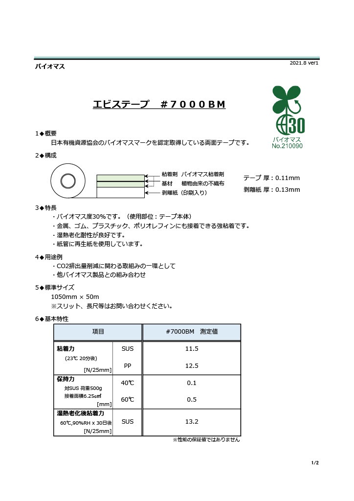 • #7000BMは日本有機資源協会のバイオマスマークを認定取得している 両面テープの製品となります。